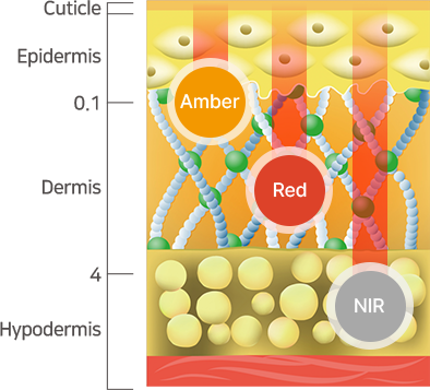 BellaDerma’s three special and safe wavelengths(Amber, Red, Near-Infrared) penetrate deep